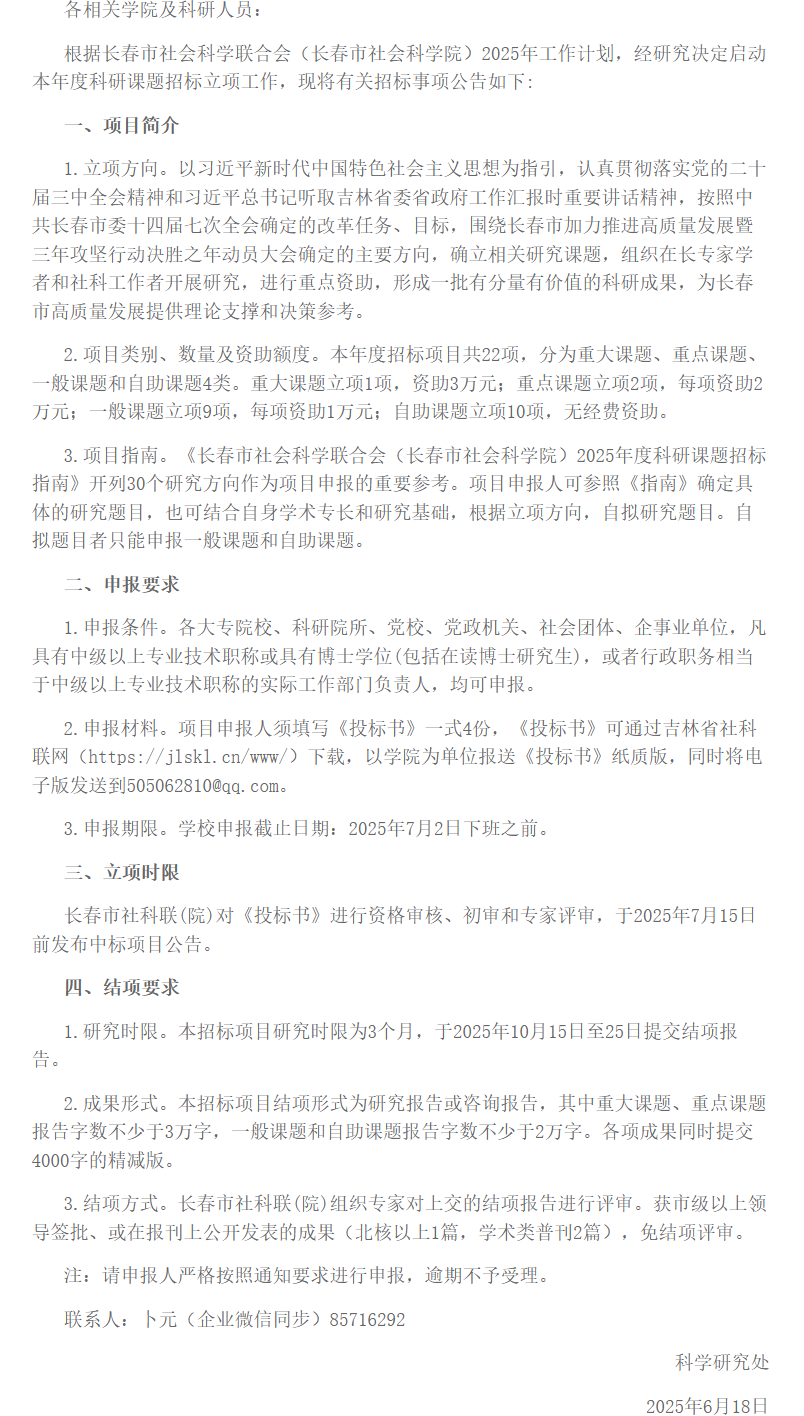 长春市社会科学联合会(长春市社会科学院)2025年度科研课题招标公告