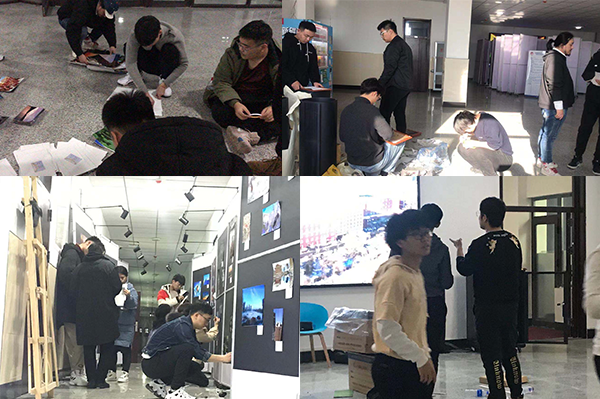 我们在现场可以看到我院教师和学生忙碌的身影。教师带领学生共同参与劳动实践,用自己勤劳的双手布置“发现工大”摄影作品展的展厅。许许多多看不着的手工细腻活和劳力活,都是教师和学生们共同完成的。