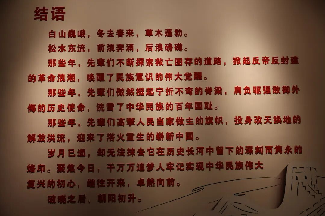 展览全景式再现了吉林人民的艰苦抗战的光辉历程。从抗战历史到新时代发展成就,一幅幅珍贵的历史照片、一件件承载记忆的实物展品、一段段生动的影像资料,全方位展现了吉林省在历史长河中的沧桑巨变与精神传承。